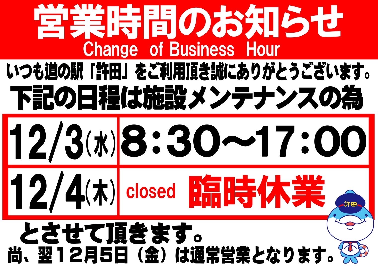 12月4日(木)は[臨時休業]となります。